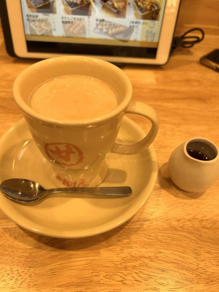 飲み物も和風なものが多かったです。せっかくなので、おかげ庵でしか飲めないきな粉のカフェオレにしました。黒蜜がついてきて美味しかったです。